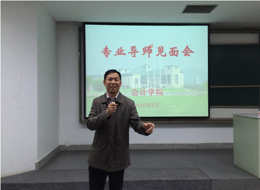 会议分为三个部分,介绍导师、讲授财会学习理念和方法、介绍学习资源和要求,由陈骏副院长主持。他向学生们热情而隆重地介绍了各位专业导师,学历、毕业学校、研究专长、学术成果,南京大学博士、厦门大学博士、成本管理研究、绩效研究、公司治理、发表学术论文、主持国家社科基金、自然科学基金项目研究,等等,学生们目不转睛地看着投影,被学术气氛包围着、感染着,感知卓越、建立梦想,脸上有赞叹、欣赏,有兴奋、期待,热烈的气氛在会场里流淌。