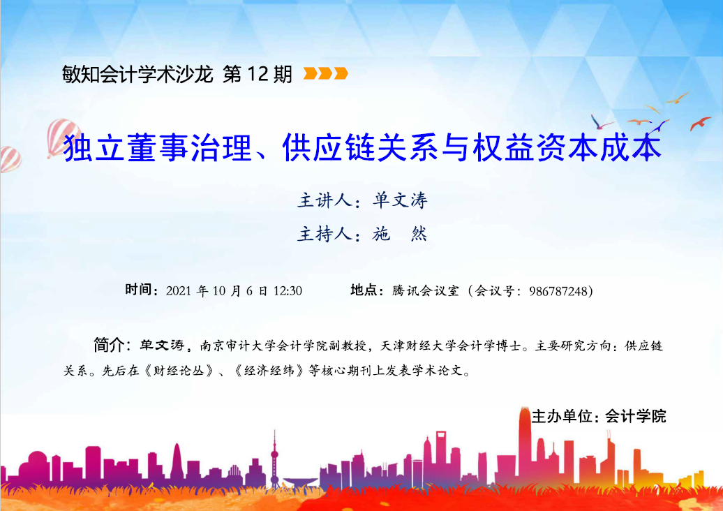 敏知会计学术沙龙第12期:单文涛-独立董事治理、供应链关系与权益资本成本