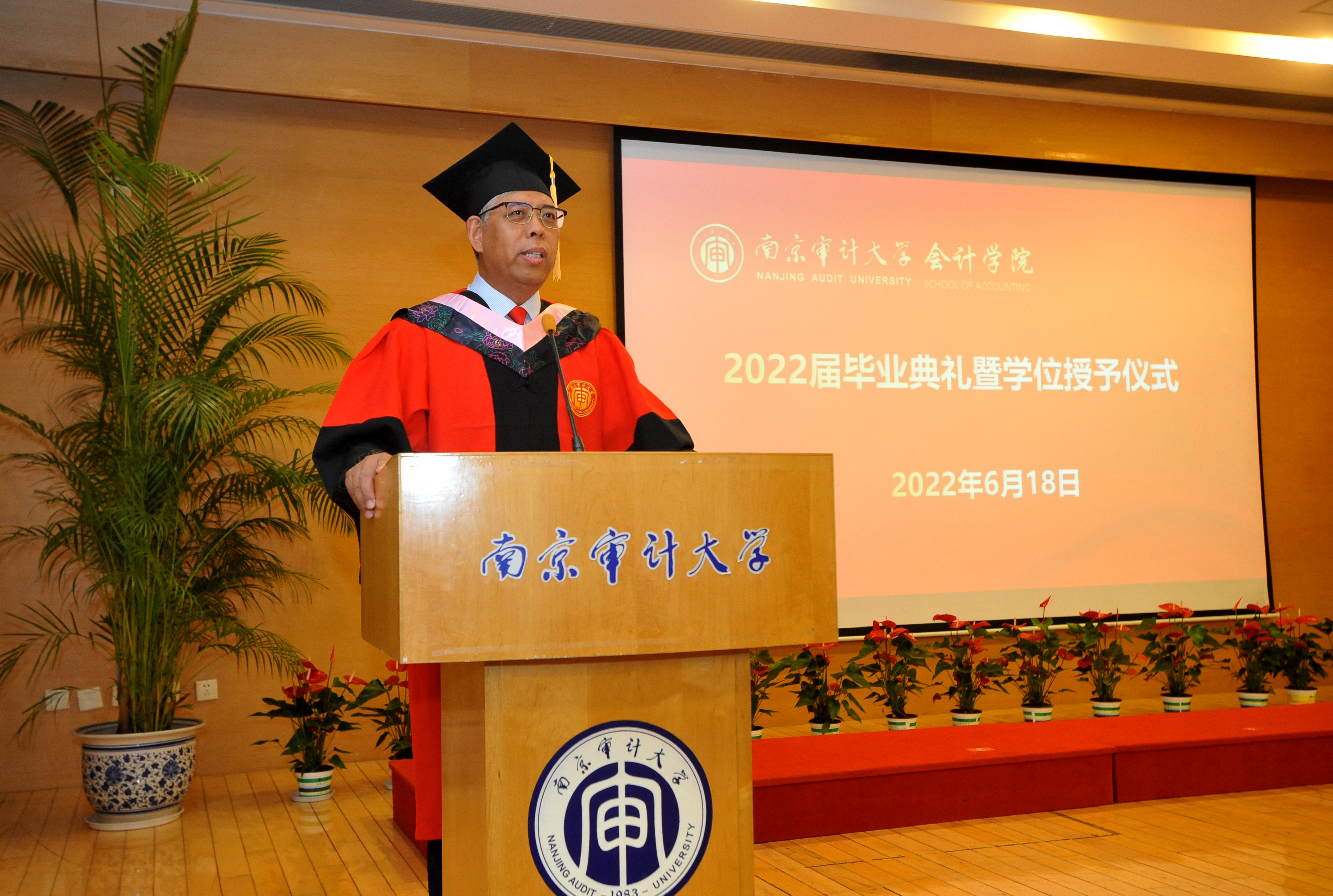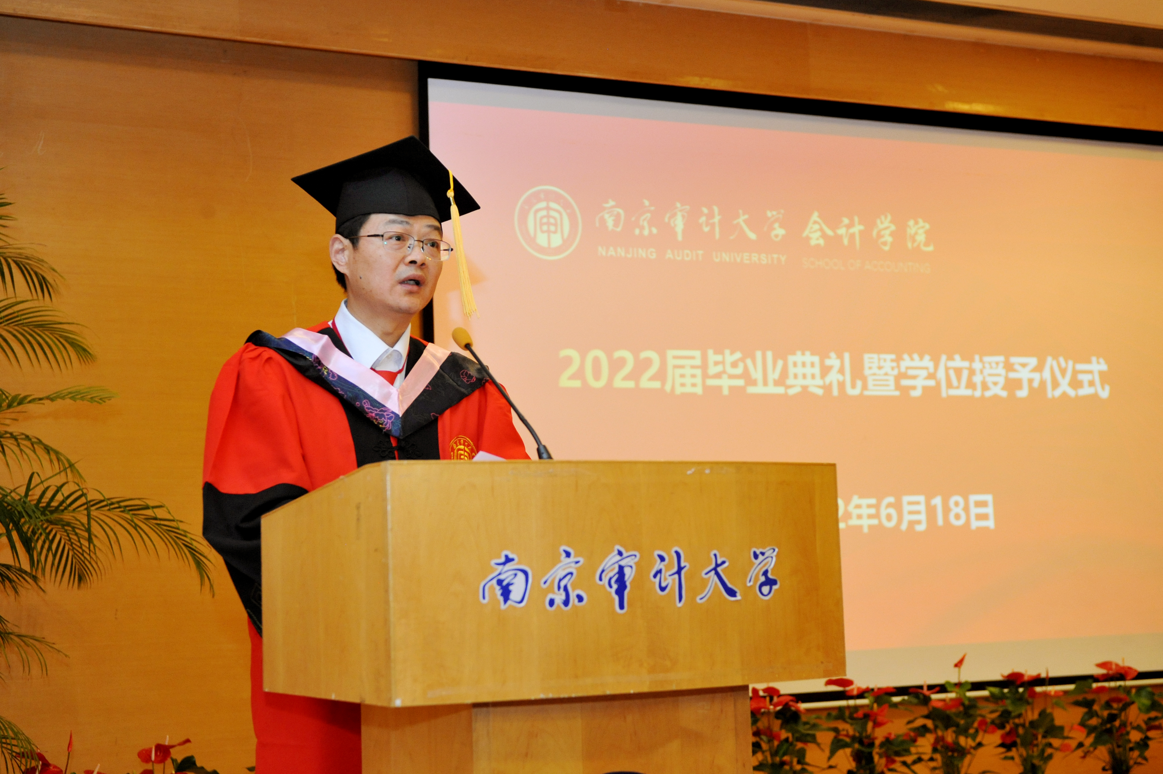 “青青老山层林染,润泽湖畔常思辨。祝贺成人卡通 2022届同学们顺利毕业!你们永远可以相信南审成人卡通 将与你们一道快速成长,同频共振,陪伴彼此,携手共进,向着最好去发展;你们更要相信自己,从今天起,你们将进入社会的大学、时代的大学,要立大志、明大德、成大才、担大任。希望学生从更广泛的视角理解会计四大前提,忘记历史成本,重估重置成本,再测可变现净值和现值,时刻关注公允价值,规划好人生战略,经营好人生旅途,管理好人生资产,编制好人生的资产负债表、利润表、现金流量表和ESG报告,为国家和社会创造可持发展的价值。”