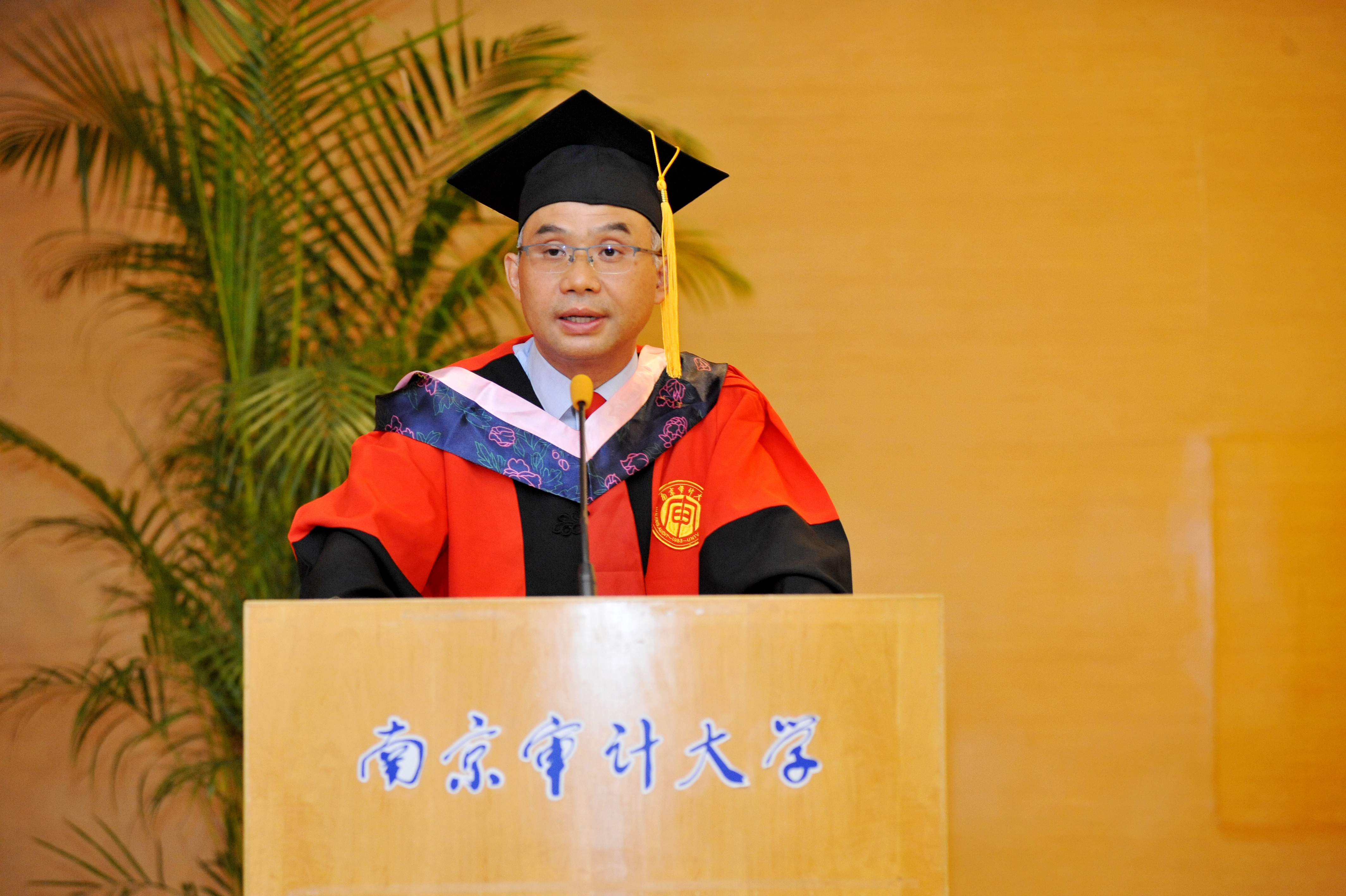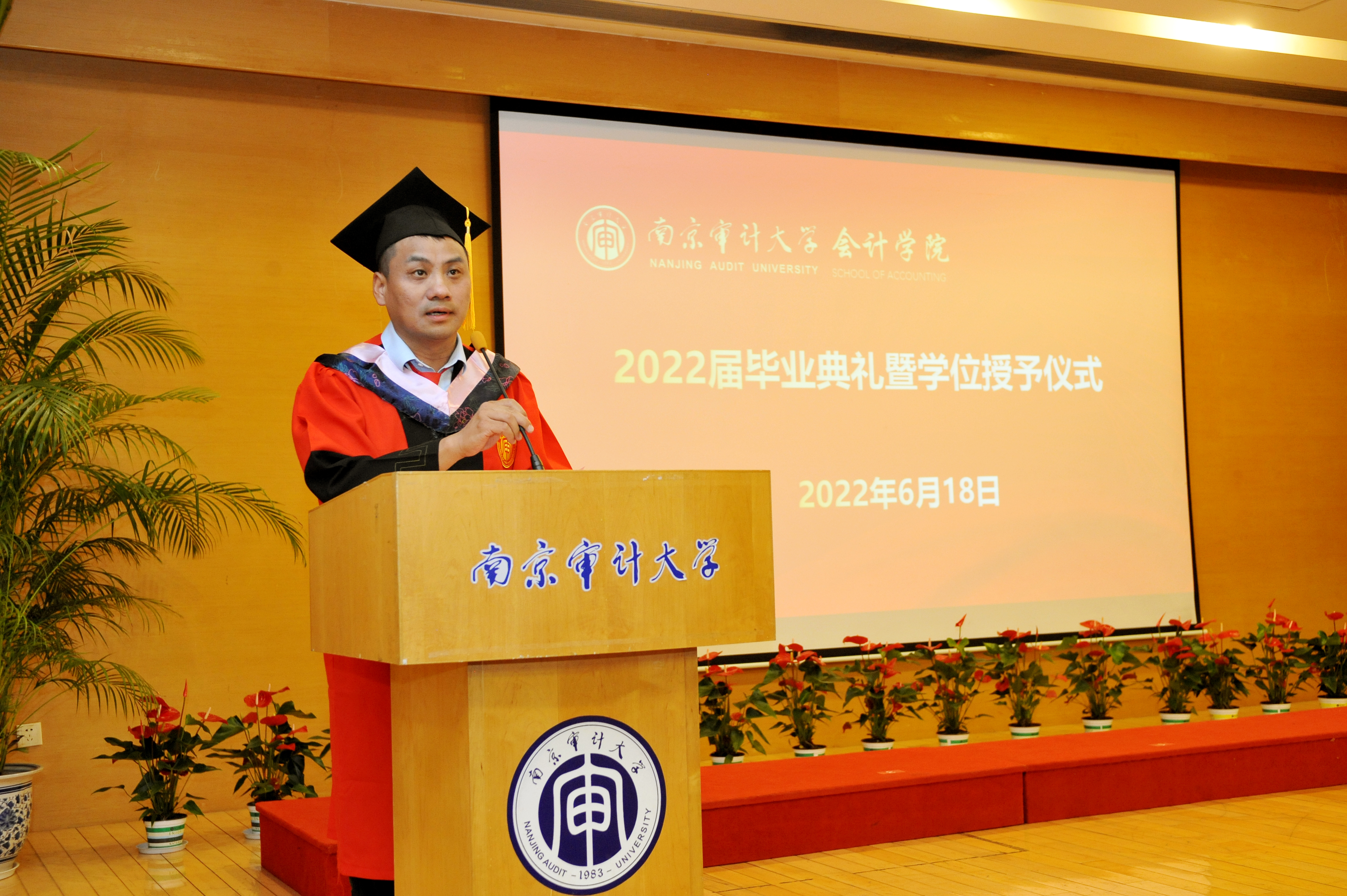 “首先,作为学生要懂得感谢自己、老师、校友。希望同学们做到以下五点,第一,要爱国奉献,做负责任的当代中国人;第二,践行南审的校训,始终保持会计人基本素养,不断学习,保持公正;第三,追求卓越,做一个不负韶华的现代职业人;第四,开放包容,学会换位思考,在数字经济时代,要勇于接受新事物;第五,珍爱自我,碰到挫折,要自信、自省、自爱。最后以十六个字送给同学们:随心而走,逐光而行,绽放自我,造福社会。”