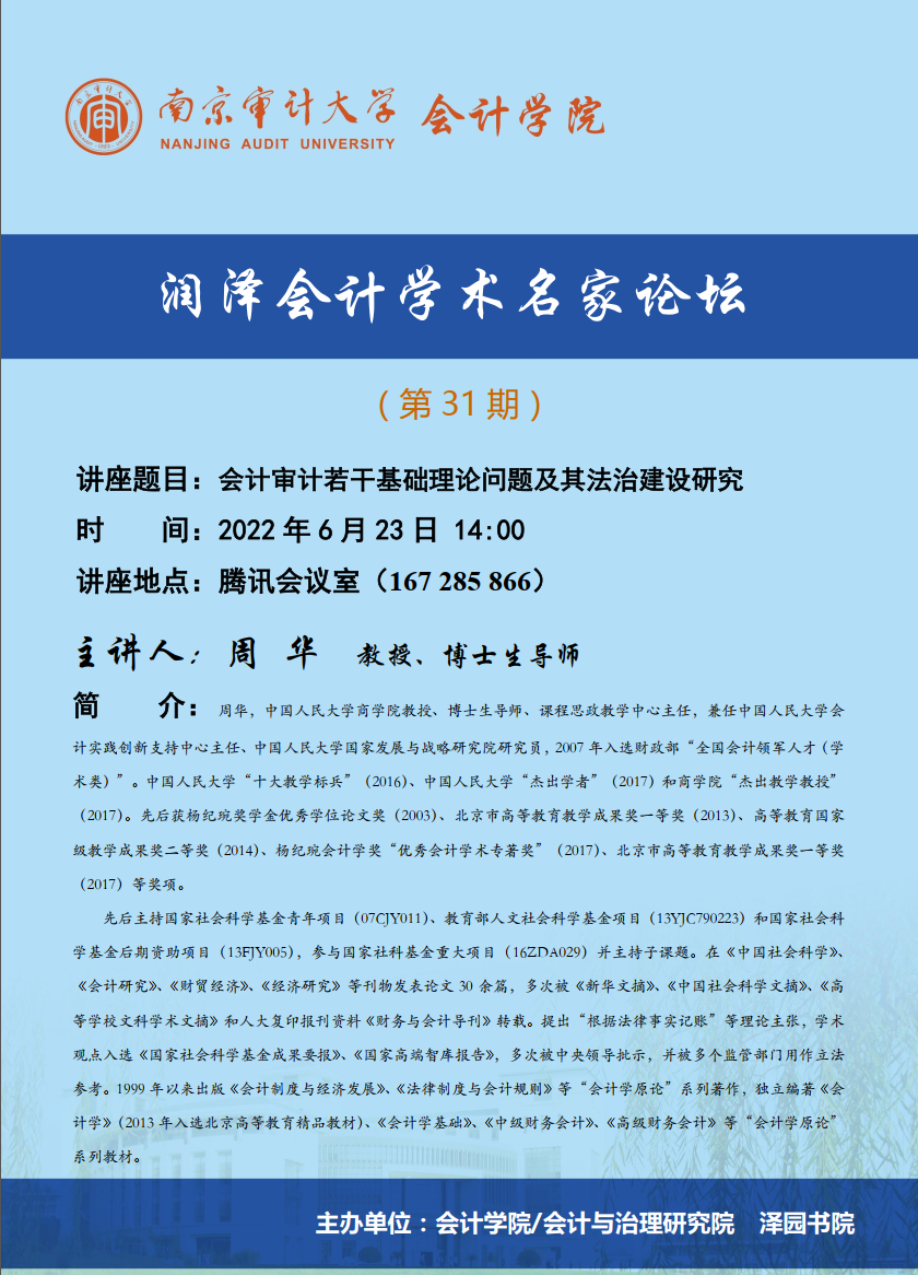 润泽会计学术名家论坛第31期:周华-会计审计若干基础理论问题及其法治建设研究