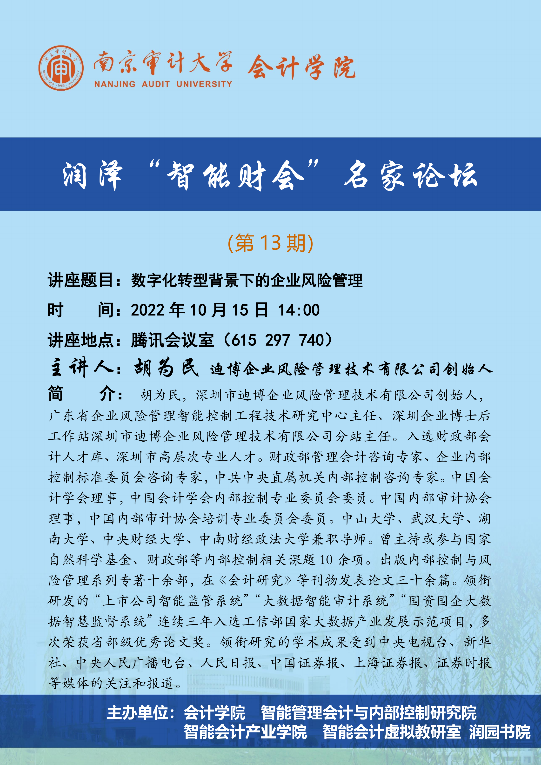 润泽“智能财会”名家论坛第13期:胡为民-数字化转型背景下的企业风险管理
