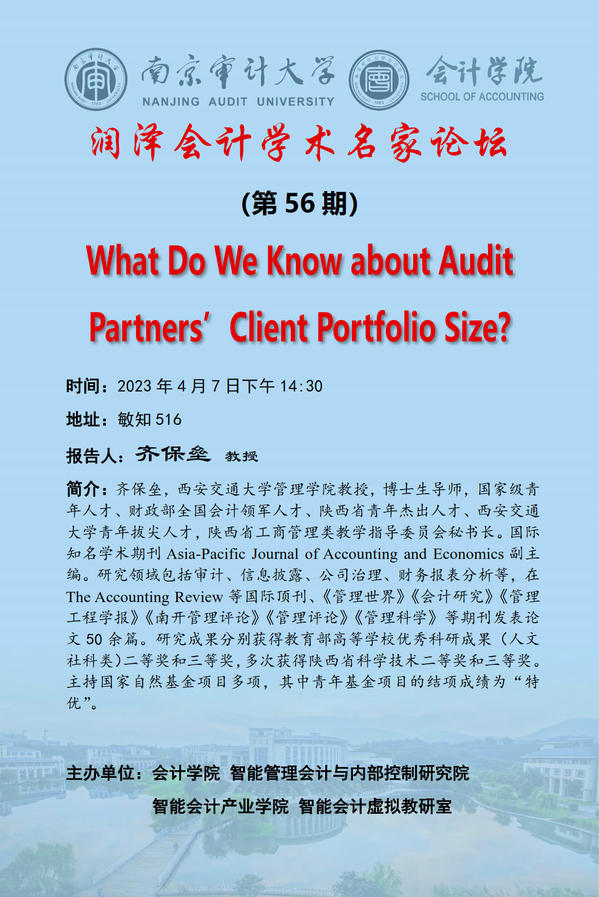 润泽会计学术名家论坛第56期:齐保垒——What Do We Know about Audit Partners’ Client Portfolio Size?
