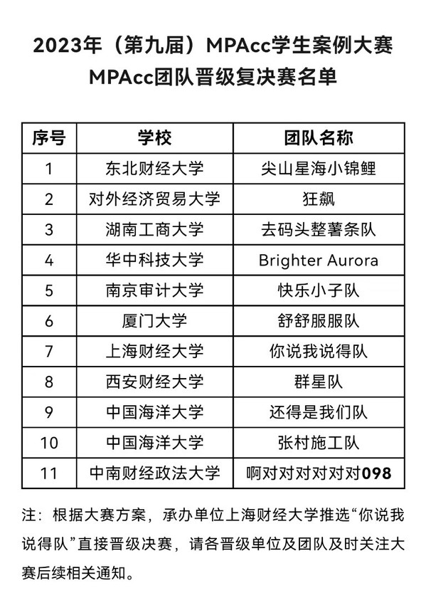 本次2023年(第九届)MPAcc学生案例大赛复决赛将于6月17日于上海财经大学举办。通过复决赛将决出特等奖、一等奖、二等奖、三等奖、单项奖。