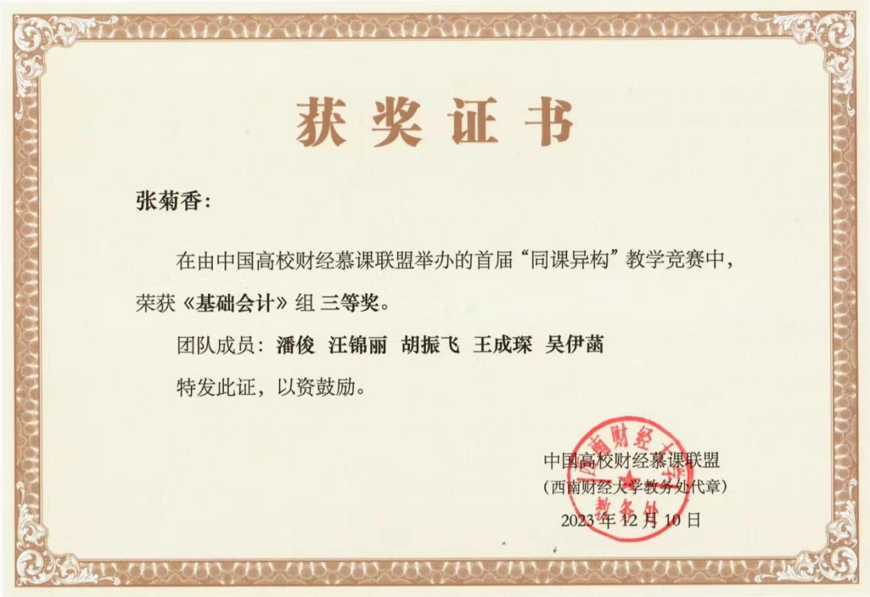2023年10月21日至22日,首届中国高校财经慕课联盟《基础会计》“同课异构”课程思政教学竞赛在东北财经大学成功举办。来自中央财经大学、上海财经大学、中南财经政法大学等全国33所知名财经院校的“基础会计”课程骨干教师展开了激烈的角逐,成人卡通 张菊香老师(团队)荣获三等奖。
