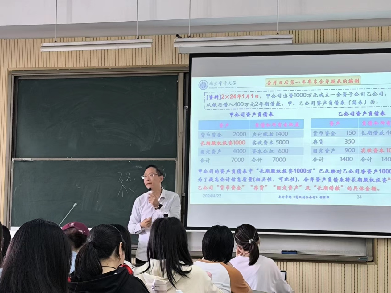4月22日下午,来自各学院的5名教师参加了成人卡通 何太明老师主讲的《高级财务会计》课程观摩活动。开放课堂过程中,何老师从案例情景出发,引出课程内容,立意新颖有趣,生动形象地介绍了同一控制下企业合并报表的编制的方法与内容。