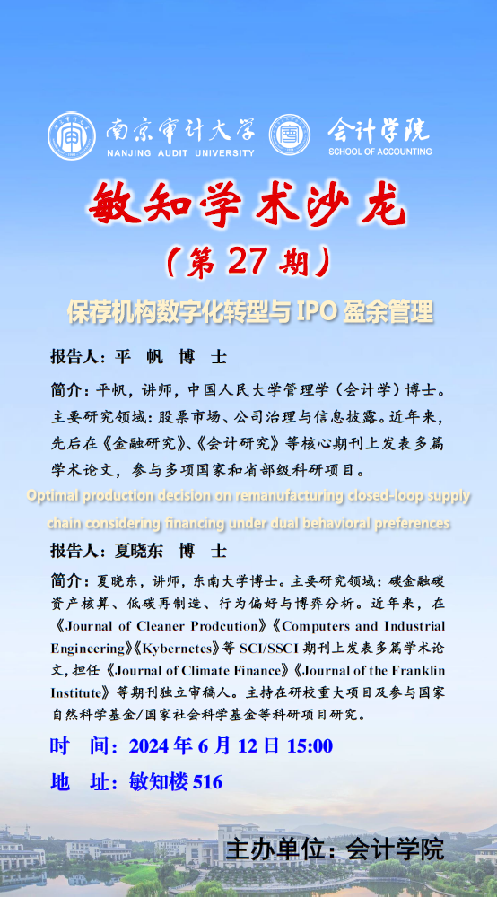 敏知学术沙龙(第 27 期):平帆、夏晓东——保荐机构数字化转型与 IPO 盈余管理、optimal production decision on remanufacturing cosed-loop supply chain considering financing under dual behavioral preferences