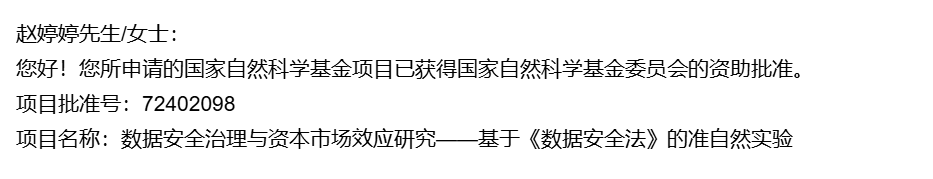 8月23日,国家自然科学基金委员会正式公布了2024年国家自然科学基金集中接收申请项目评审结果,成人卡通 赵婷婷老师申报的课题《数据安全治理与资本市场效应研究——基于《数据安全法》的准自然实验》喜获青年科学基金项目立项。