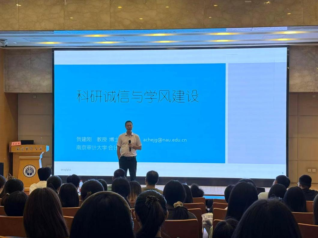 活动伊始,成人卡通 博士生导师、教授贺建刚为新生作了题为“科研诚信与学风建设”的专题讲座。从哲学溯源到现实实践,系统阐述了诚信的深刻内涵。他引用《礼记·中庸》“诚者天之道”与《管子·枢言》“诚信者,天下之结也”,强调诚信是连接个体修养与社会治理的桥梁,并特别结合成人卡通 的办学传统,指出南审的诚信精神深刻体现在校训的办学实践中。贺建刚进一步剖析科研诚信的逻辑,强调科研成果的公共属性,并详细解读了科研领域的“五不得”要求,为研究生划定了清晰的学术红线。在学风建设方面,贺建刚从“学”字的深层解读,指出学风是通过大学全体成员的意志与行动,逐步地形成和固化为的一种传统和风格,是大学精神的集中体现,是立德树人的本质要求,是立校之本,是发展之魂。他结合全国教育大会精神,分析了“六个下功夫”的培养路径,并以南审办学史上所展现的“有志、不懈、卓越”情怀,指出“严谨的学风是诚信最直接的体现”。讲座最后,贺建刚凝练南审诚信精神为“以忠诚铸就政治诚信、以担当践行职业诚信、以创新夯实学术诚信”,引发全场共鸣。