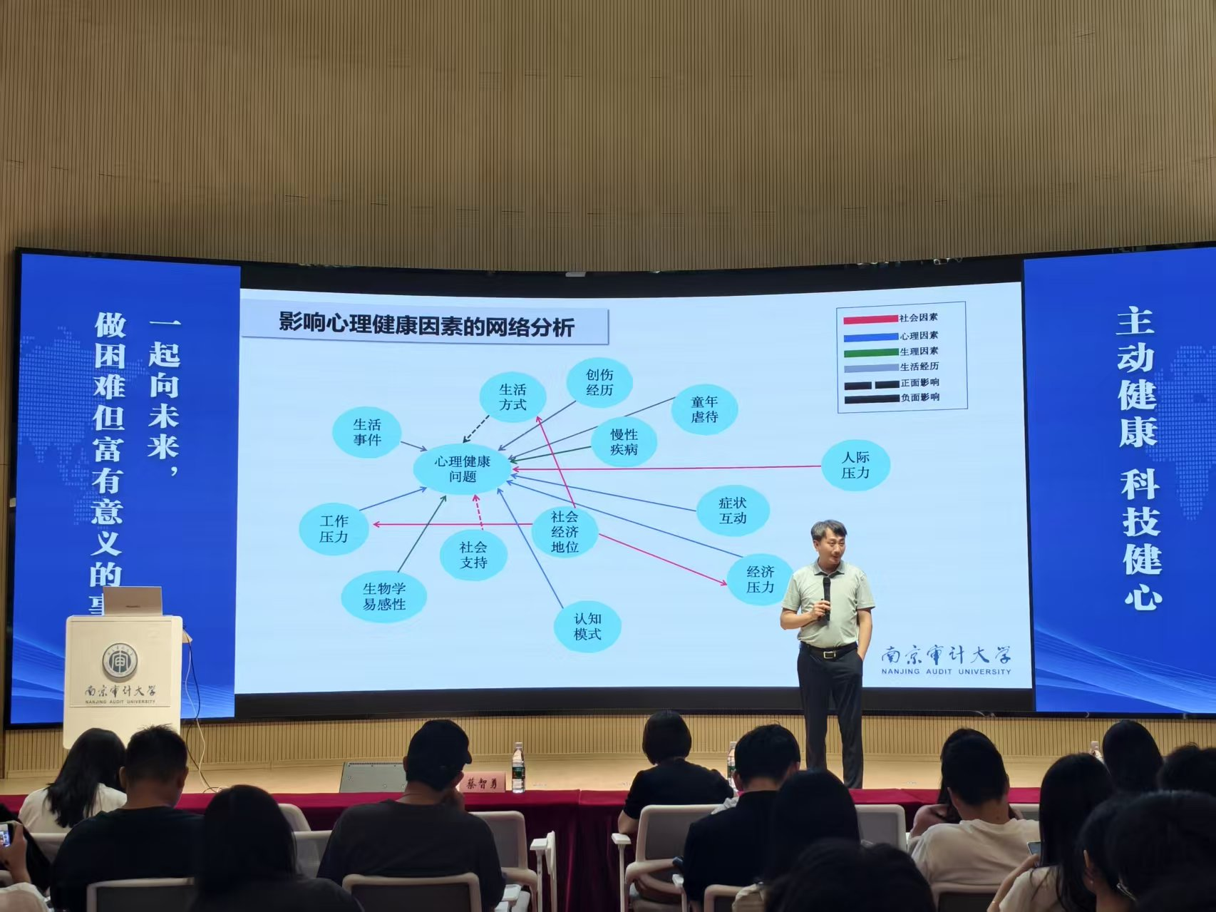 课程开篇,蔡智勇围绕“主动健康”与“治愈即自愈”两大核心理念展开讲解,着重强调“自己是健康的第一责任人”。他指出,研究生阶段面临学业、科研、社交等多重压力,心理健康的维护不能依赖被动干预,而需建立主动管理的意识,唯有主动关注自身心理状态,才能及时发现潜在问题,为心理健康筑牢第一道防线。同学们应该主动学习应对不可控问题的方法,培养解决问题的思维。