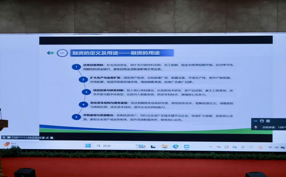 顾荣华作“企业融资实践与风险管控”的汇报。他指出,高效融资需注重方案设计的三大要点:融资类型多元组合、深度匹配资金需求、精准明确偿债来源。在金融机构选择上,应广泛接触获取首轮报价,并通过现场磋商实现深度互动。融资要素匹配则应确保结构合理、期限平滑、成本最低、规模适度。针对风险管控,顾荣华强调企业需重点关注融资成本、偿债能力、流动性和合规政策四类风险,通过建立应急储备资金等措施,构建全流程风险防控机制,为企业稳健发展提供财务保障。