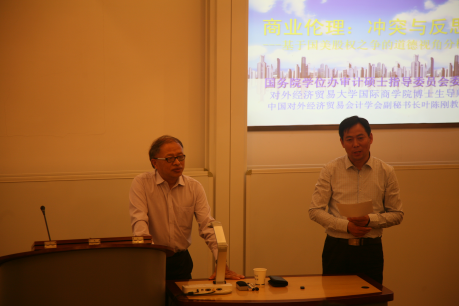 叶陈刚教授用轻松幽默的话语营造了一个愉悦的氛围。他以国美股权之争的道德反思提出了商业伦理的一系列问题:做人重要还是做事重要?忠诚重要还是能力重要?来启发师生思考。接着从不同的角度介绍对市场经济的认识,并强调了市场经济还体现为伦理经济,讲究仁义礼智信,信内求财;温良恭谦让,让中取利,依靠义务、良心、荣誉、节操、人格来建立相互交往的友好关系,以确保社会成员的行为合法合情合理。叶教授提出了商业伦理起点是道德责任与社会责任;商业伦理规范是基本道德要求;商业伦理功能是社会与企业可持续发展;商业伦理原则是四项基本原则;商业伦理关键是知行合一,贵在力行。最后叶教授根据自己三十几年来的工作,生活经验,把伦理在商业中的巨大作用作了生动、详尽的阐述,提出了“做人比做事重要,忠诚比能力重要”的见解,鼓励大家塑造自己的道德人格,培养良好的思想,形成高尚的精神,坚持优良的工作作风。