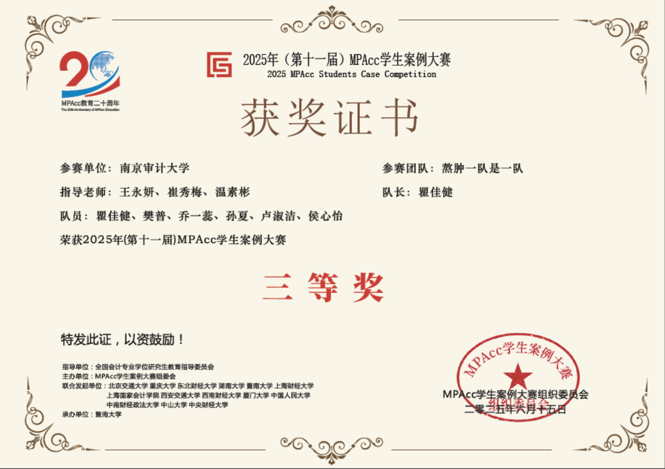 6月15日,2025年全国第十一届MPAcc学生案例大赛在暨南大学举办。由王永妍、崔秀梅和温素彬三位老师指导的由2024级会计专硕研究生瞿佳健、乔一蕊、孙夏、樊普、卢淑洁、侯心怡组成的“熬肿一队是一队”凭借优异表现,经过初赛第一阶段、第二阶段,冲进全国前30强,荣获全国三等奖。